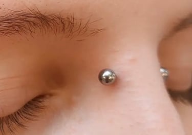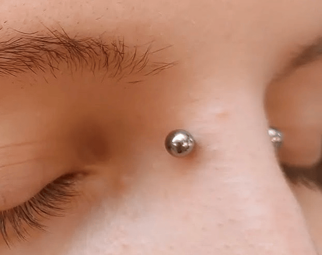 Opis: Geometryczne przekłucie skóry na grzbiecie nosa, pomiędzy oczami.