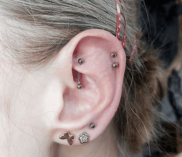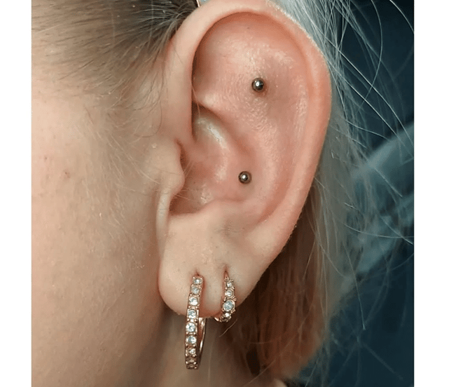 Opis: Przekłucie przedniej chrząstki, tuż nad tragusem. Może być pojedyncze, podwójne lub potrójne.