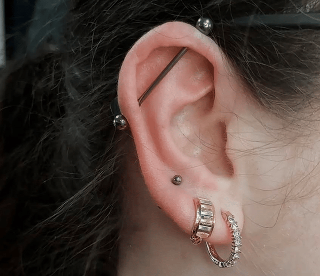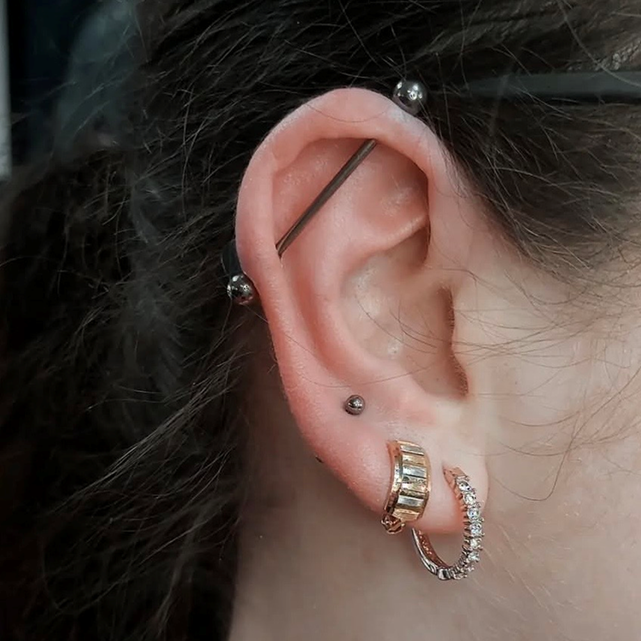 Opis: Przekłucia łączące dwa otwory jednym długim kolczykiem (industrial) lub dwoma otworami i kółkiem (orbital).