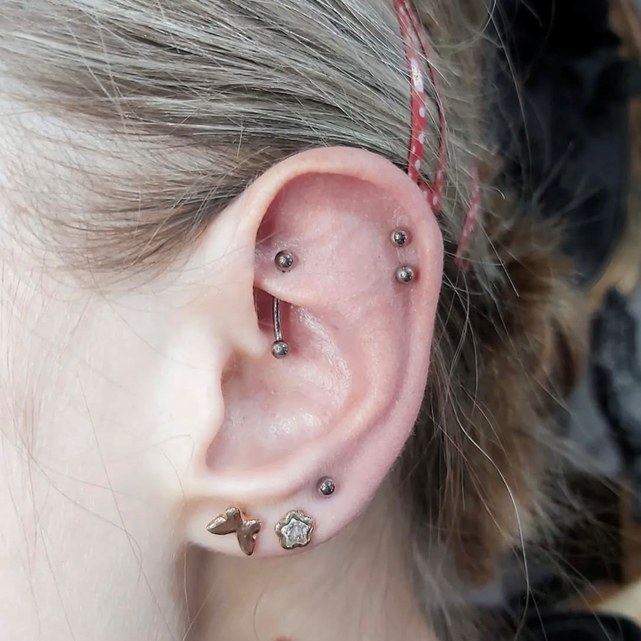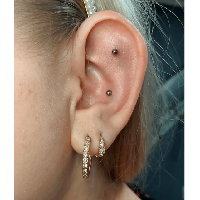 Opis: Przekłucie płaskiej części chrząstki ucha, idealne pod minimalistyczne kolczyki i małe ozdoby.